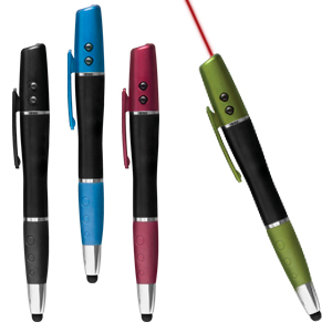 BOLÍGRAFO MULTIFUNCIÓN CON ARILLOS, PUNTA METÁLICA Y GRIP TIPO SILICÓN. FUNCIONES: LUZ BLANCA, PUNTA TOUCH Y LASER.